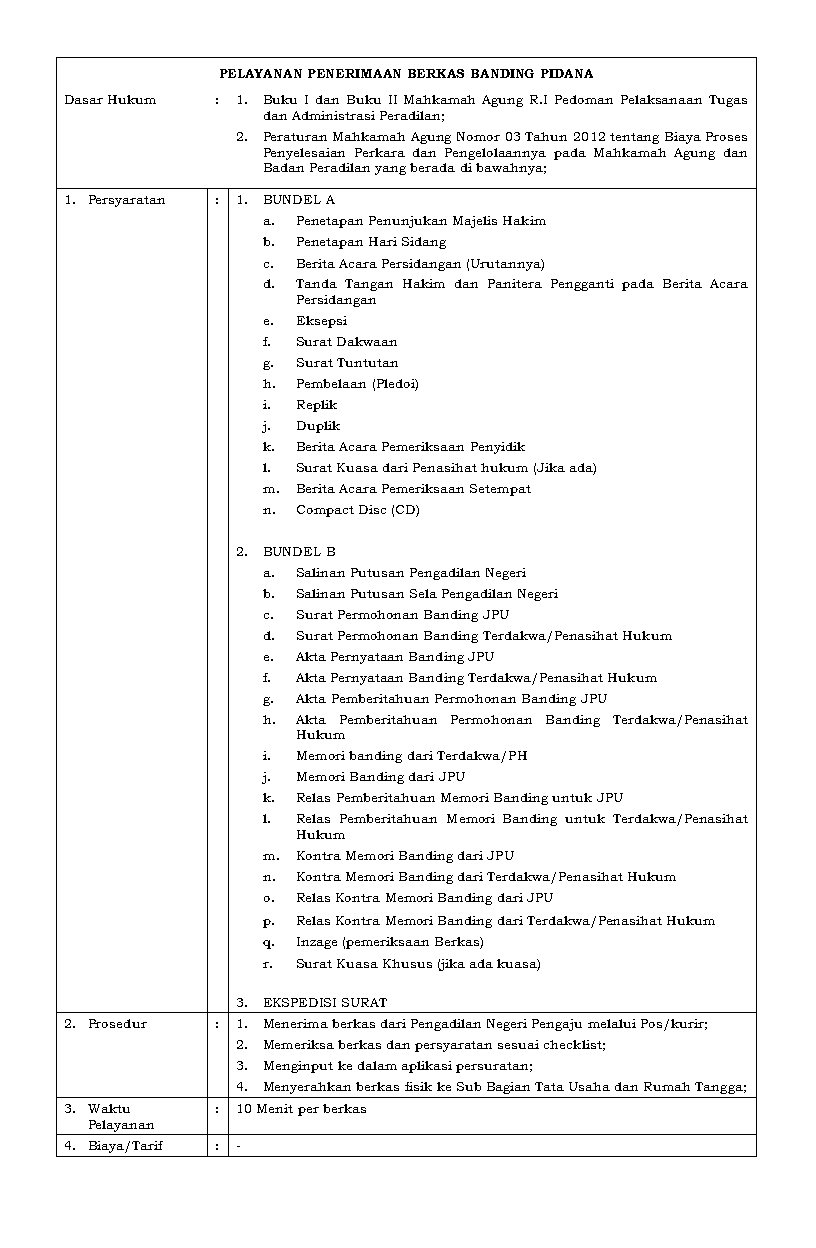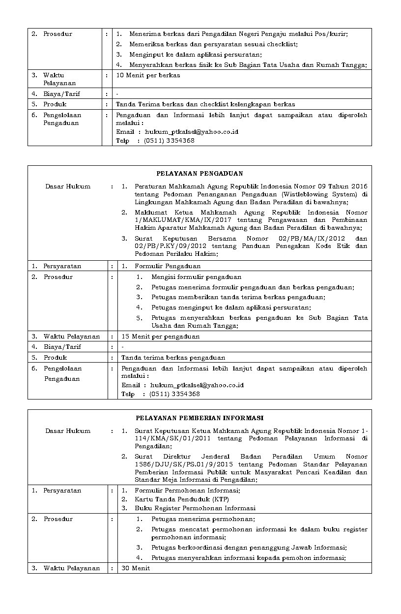 Syarat dan tata cara pengaduan mengacu pada Lampiran Keputusan Ketua Mahkamah Agung RI No. 076/KMA/SK/VI/2009 tanggal 4 Juni 2009 tentang Pedoman Pelaksanaan Penanganan Pengaduan di Lingkungan Lembaga PeradilanSelengkapnya